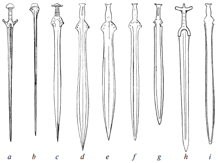 Рис. 10. Три меча раннего бронзового века: а – Крит; b – Ирландия; с – Дания. Три меча середины бронзового века: d – Англия; e – Италия; f – Микены. Три меча позднего бронзового века: g – Великобритания; h – Дания; i – Австрия (Гальштатт)