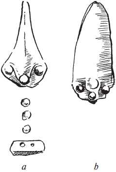 Рис. 2. а – бронзовый нож из Хельперторпа (Йоркшир). Показано, как он заточен для того, чтобы образовалось острие; b – лезвие похожего ножа, незаточенное