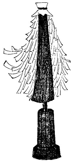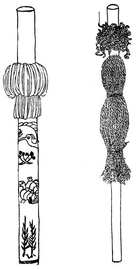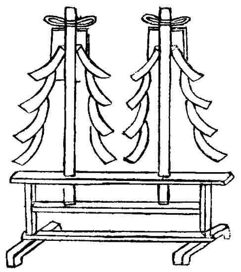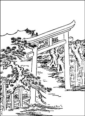 Tori-wi.--The approach to a Shinto shrine is marked by one or more gateways or arches of the special form shown in the illustration (p. 233) and known as tori-wi. This word means literally "bird-perch," in the sense of a henroost. By analogy it was applied to anything of the same shape, as a clothes-horse, or the lintel of a door or gateway. As an honorary gateway, the tori-wi is a continental institution identical in purpose and resembling in form the turan of India, the pailoo of China, and the hong-sal-mun of Korea. When introduced into Japan at some unknown date (the Kojiki and Nihongi do not mention them) the Japanese called them tori-wi, which then meant simply gateway, but subsequently acquired its present more specific application. It sometimes serves the purpose of marking the direction of a distant object of worship.[189]