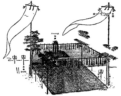 Buddhist Rites.--The performance of Buddhist rites incapacitated a man from the service of the Shinto Gods until he had been subjected to purification. For an infringement of this rule, Shinto functionaries might be fined or dismissed. The use of Buddhist terms was forbidden to every one concerned in the Shinto ceremonies at Ise and Kamo. A Sutra was called "tinted paper," Buddha the "middle child," a Buddhist temple a "tile roof." Buddhist priests and nuns were ironically styled the "long-haired ones." At Ise Buddhist priests were not admitted to the sacred precincts beyond a certain cryptomeria tree. A separate place was assigned them for their prayers.