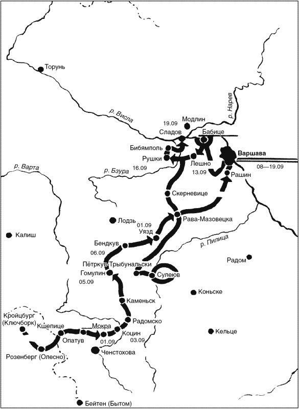 Основные силы польской армии, отступавшей из западной части Польши, попытались выйти к Варшаве южнее Вислы. Наша дивизия – усиленная полком «Лейбштандарт», 33-м пехотным полком и другими артиллерийскими и саперными частями – получила приказ удержать позиции у Варшавы. Цель состояла в том, чтобы блокировать отступающие с запада к Варшаве польские войска. К востоку от нас располагалась только 1-я танковая дивизия. Вместе с ней мы были предоставлены сами себе, находясь примерно в 100 километрах в глубине неприятельской территории в отрыве от других германских соединений.