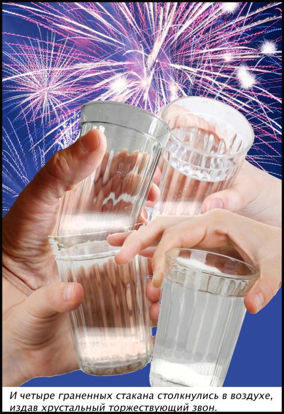 И четыре стеклянных гранёных стакана, посланные с большим энергетическим импульсом навстречу друг другу, столкнулись в воздухе, издав хрустальный торжествующий звон…