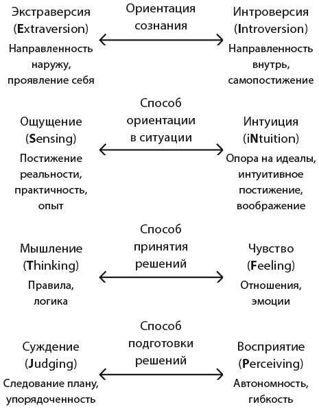 MBTI (Myers — Briggs Type Indicator) — известный опросник, предназначенный для психологического тестирования. Он основан на типологии личности, которую в 1940-х годах разработали Изабель Майерс и Кэтрин Бриггс6, отталкиваясь от работ Карла Юнга. Опросник достаточно простой и понятный, а потому до сих пор очень популярный. Например, раньше было модно определять совместимость партнеров по группе крови, а сейчас некоторые используют для этого MBTI.
