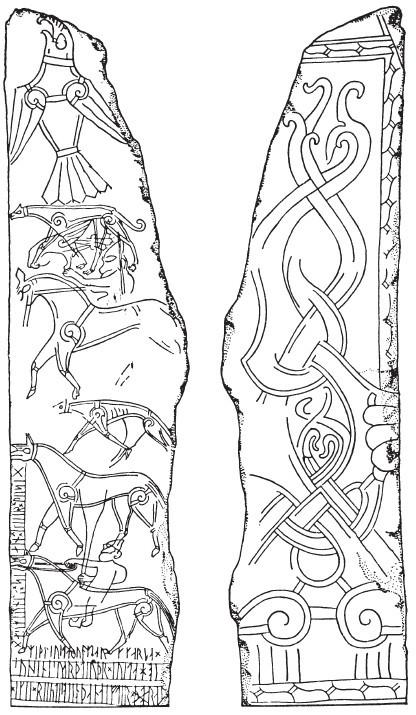 Очевидно, рисунки на камне – иллюстрация к легенде о Сигурде. «Под большой орнаментальной птицей, которая, вероятно, представляет собой некий символ, изображен человек на лошади, на руке у него ястреб, рядом бегут собаки. Это, судя по всему, Сигурд, отправляющийся на охоту, ту самую, что стала для него роковой. Ниже – конь без всадника: Грани пришел домой после смерти своего хозяина. Под ним – всадник с обнаженным мечом, возможно, убийца Сигурда Хёгни. На оборотной стороне – орнамент. Не исключено также, что здесь изображено появление умершего в загробном мире