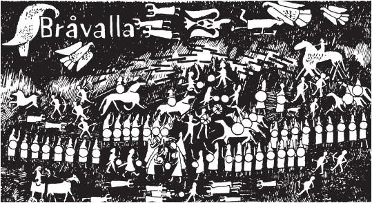 Соперничество Харальда и Сигурда разрешилось в сражении при Бравелле, занявшем, наравне с последним боем Хрольва в Лейре, свое место в легендарной героической истории севера. Подданные Харальда, говорят нам, в конце концов невзлюбили его за то, что он был стар и жесток, и решили избавиться от него каким-нибудь неблаговидным образом. Он же предпочел умереть в бою и послал вызов конунгу Сигурду. Тот и другой собрали себе большое войско; на обеих сторонах сражались лучшие воины северных народов: германцы, славяне, жители Курляндии, Ливонии и тогда еще неизвестной Исландии, одетые в железо амазонки, и сам одноглазый бог войны явился на поле сражения в образе Харальдова возничего. Флот Харальда заполнил весь пролив между Зеландией и Сконе, так что его можно было перейти посуху, паруса шведских кораблей закрыли горизонт. Оба войска подошли к месту битвы, вероятно, неподалеку от Бравелле к северу от современного Норркёпинга на северо-восточной границе Восточного Гаутланда. Там они выстроились в боевой порядок, после чего Харальд и Сигурд обратились каждый к своим воинам с речью. Заиграли трубы и жаждущие крови копья устремились в бой. «Казалось, небо пало на землю, поля и леса поглотила бездна; все смешалось, и первозданный Хаос вновь завладел миром. Небеса и твердь слились в неистовом буйстве, и вселенная обратилась в руины»[21]. Сражение закончилось только после гибели Харальда: он упал со своей колесницы, и Один-возничий убил его дубинкой, после чего старый конунг присоединился к его дружине в Вальгалле. Сигурд похоронил своего дядю с честью: согласно исландским источникам, он возложил его тело на колесницу и отвез кайрну к месту погребения со всевозможными сокровищами – дарами от победителей; Саксон говорит, что его сожгли на роскошном погребальном костре, а прах отправили в Лейре[22].