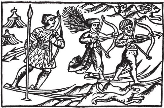 Рис. 2. Саамы охотятся на лыжах (Олаус Магнус)
