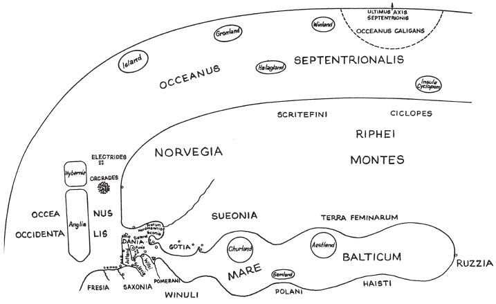 Однако, говоря об этих землях, нельзя не рассказать также о Норвегии и Швеции, близких соседях Дании, которые сродни ей также по языку. Поэтому я опишу их местоположение и климат, как я описал местоположение и климат Дании. Эти страны лежат возле Северного полюса под созвездиями Волопас и Большая Медведица. Самые удаленные их области попадают в зону вечной мерзлоты, и холода в этих краях такие лютые, что люди там жить не могут. Норвегию природа наделила бесприютными каменистыми равнинами; скалистые хребты окружают со всех сторон эти бесплодные земли, и одинокие утесы дополняют картину мрачного запустения. В дальних ее пределах дневное светило не заходит и ночью: солнце, презрев порядок чередования света и тьмы, изливает свое сияние постоянно во всякий час…
