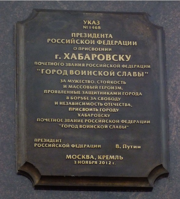 В соответствии с «Положением об условиях и порядке присвоения почётного звания Российской Федерации „Город воинской славы“», утверждённым Указом Президента Российской Федерации №1340 от 1 декабря 2006 года в Хабаровске возведена стела с изображением герба города и текстом Указа Президента Российской Федерации о присвоении городу этого звания.