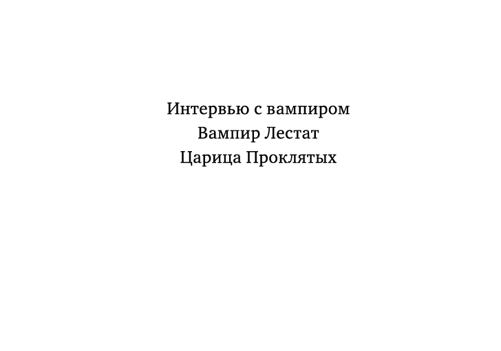 Я — вампир Лестат. Помните меня? Тот самый вампир, который стал суперзвездой рока и написал автобиографию. Тот самый светловолосый и сероглазый вампир Лестат, обладавший неутолимой жаждой известности и славы. Если помните, я хотел стать символом зла в сияющем и прекрасном веке, где совершенно не было места злу в том его буквальном и чистом виде, воплощением которого я являюсь. Мне даже казалось, что, выступая на театральной сцене в образе дьявола, тем самым я действую во благо.