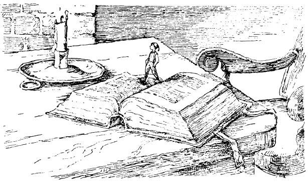 Книга по-прежнему лежала на столе, с виду всё такая же. Но с ней произошло что-то уж вовсе несусветное: чтобы разобрать хоть слово, мальчику пришлось влезть на книгу!