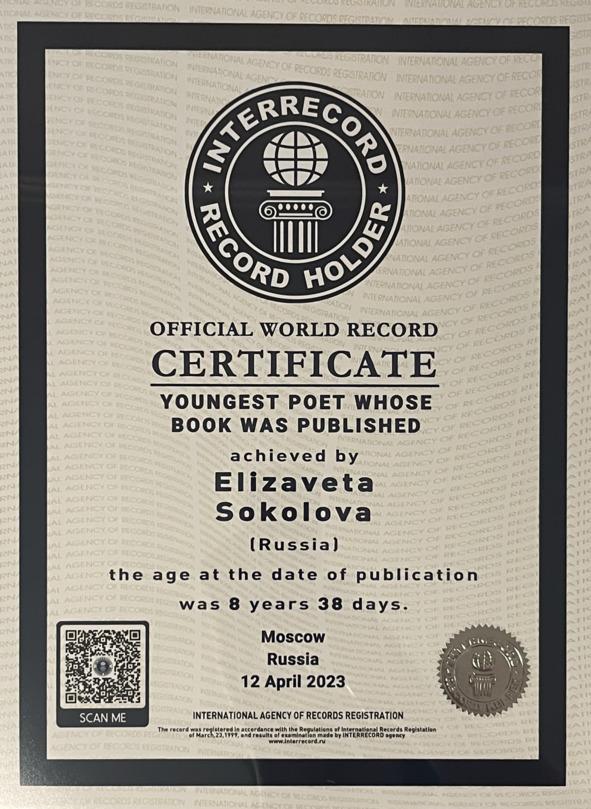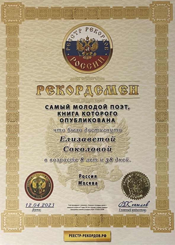 В этом же году Елизавета Соколова стала рекордсменом России, а также по версии «Международного агентства регистрации рекордов «Интеррекорд» внесена в международную книгу рекордов в номинации «Самый молодой поэт, книга которого опубликована» (индивидуальный номер рекордсмена РРР-120777-2023).
