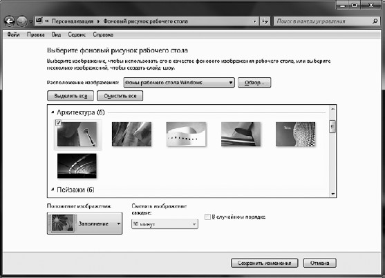 В Windows 7 появилась целая галерея красивых изображений (рис. 2.12), которыми вы можете украсить Рабочий стол.Чтобы открыть ее, щелкните на ссылке Фон рабочего столав окне Персонализация.