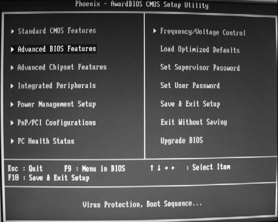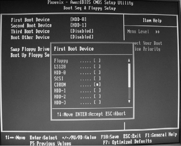 В первую очередь в настройках BIOS в качестве первого загрузочного устройства необходимо указать CD-ROM, так как установка системы будет проводиться с DVD. Поскольку вы являетесь начинающим пользователем и наверняка ни разу не сталкивались с BIOS, рассмотрим пошагово весь процесс изменения порядка загрузки компьютера на примере Phoenix-Award BIOS. Если ваш ПК имеет другую версию BIOS, вид меню и название его пунктов могут несколько отличаться, но принципиально порядок действий останется тем же.
