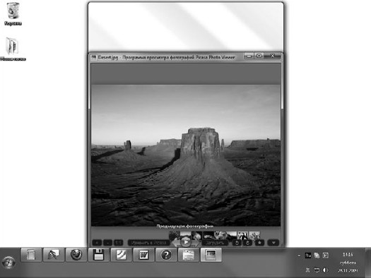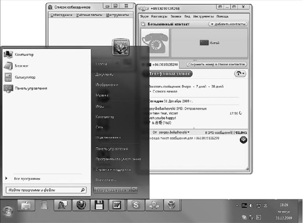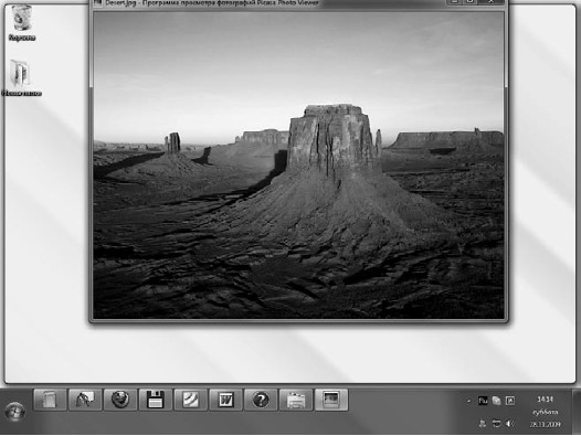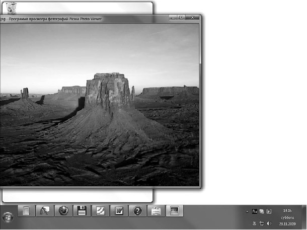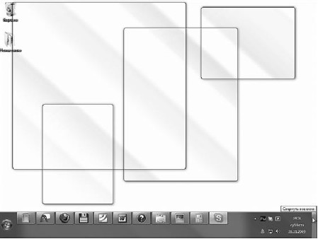 • «Взгляд» Aero.Кнопка Свернуть все окнав Windows 7 перемещена в противоположный привычному конец Панели задач.При этом возможности этой кнопки расширились. Попробуйте подвести указатель мыши к кнопке Свернуть все окна– все открытые окна станут прозрачными, останутся только их контуры и будет виден Рабочий стол(рис. 2.9). Такой Aero-«взгляд» поможет вам быстро увидеть Рабочий стол.Уберите указатель мыши с кнопки Свернуть все окна– все вернется на прежнее место.