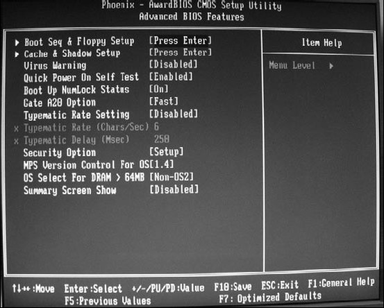 Чтобы попасть в меню BIOS, сразу после включения компьютера многократно нажимайте клавишу Delete.В результате на экране появится меню, изображенное на рис. 1.3. С помощью клавиш управления курсором переместитесь к пункту Advanced BIOS Features(Расширенные настройки BIOS) и нажмите Enter.В открывшемся подменю (рис. 1.4) нас интересует пункт Boot Seq & Floppy Setup(Последовательность загрузки и установки дисковода), находящийся в списке первым. Убедитесь, что он выделен красным цветом, и нажмите Enter.