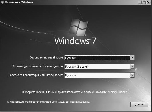 После того как будет выполнено копирование файлов, необходимых для начала работы программы установки Windows 7, вы увидите ее первое окно (рис. 1.6), в котором нужно будет выбрать устанавливаемый язык, формат времени и раскладку клавиатуры. Если во всех списках указан вариант Русский,не меняйте данные настройки и просто нажмите Далее.На следующем этапе предстоит выбрать действие, которое вы хотите совершить, используя программу установки. Это может быть как собственно установка, так и восстановление работоспособности системы, в которой произошел сбой. Поскольку сейчас нас интересует первый вариант, щелкните на кнопке Установить.