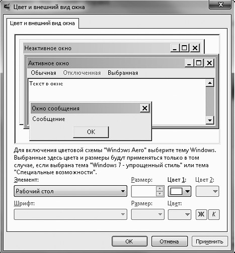 Windows 7 позволяет отключить стиль Windows Aero и перейти к упрощенному стилю Windows 7. Это актуально тогда, когда при выборе стиля Windows Aero ресурсов компьютера недостаточно для хорошей производительности. Чтобы сменить стиль, щелкните на ссылке Дополнительные параметры оформления.В результате откроется окно Цвет и внешний вид окна,аналогичное тому, которое присутствовало в предыдущих версиях Windows (рис. 2.13).