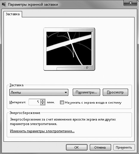 Флажок Начинать с экрана входа в системупредназначен для защиты компьютера от несанкционированного доступа во время отсутствия пользователя. Установка данного флажка имеет смысл только в том случае, если ваша учетная запись защищена паролем. Тогда после выхода из заставки появится окно входа в систему с предложением ввести пароль. Прежде чем защитить компьютер подобным образом, обратите внимание на временной интервал включения заставки – если он достаточно велик, злоумышленник может сделать «все свои дела» еще до ее появления.