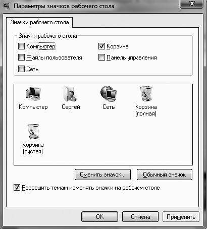 Как уже говорилось в начале главы, после установки Windows на Рабочем столеимеется всего один значок – Корзина.Доступ к системным папкам можно получить только с помощью меню Пуск.Однако вы можете поместить на Рабочий столзначки важнейших системных папок. Для этого щелкните на ссылке Изменение значков рабочего столав окне Персонализацияи в открывшемся окне (рис. 2.15) отметьте флажками названия тех папок, которые желаете видеть на Рабочем столе.