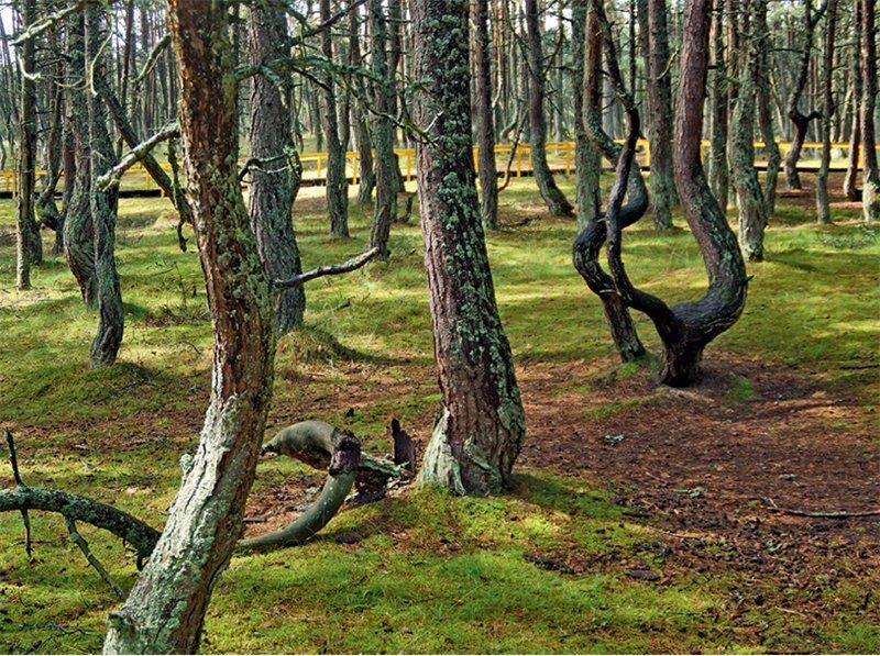 На Круглой дюне, узком песчаном перешейке на Куршской косе, раскинулся Танцующий лес. Этот участок соснового леса прославился своими причудливо изогнутыми деревьями, словно застывшими в движении. Местные жители рассказывают, что однажды в этот лес пришла девушка с волшебной флейтой. Она играла так красиво, что деревья начали кружиться в танце и с тех пор остались в этих изогнутых формах.