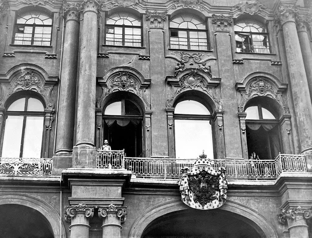 Николай II на балконе Зимнего дворца перед провозглашением Манифеста о вступлении России в войну. 1 августа 1914 года
