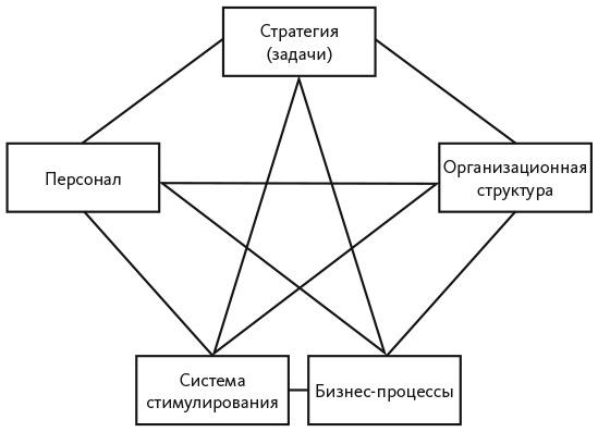 Слова «стратегия» многие боятся, так что можем переформулировать, назвать это «бизнес-целью», например. В любом случае именно здесь берут начало все стратегические задачи. Сам Джей Гэлбрейт рекомендует двигаться по часовой стрелке. В этом случае дальше идет организационная структура, бизнес-процессы, система стимулирования и персонал.