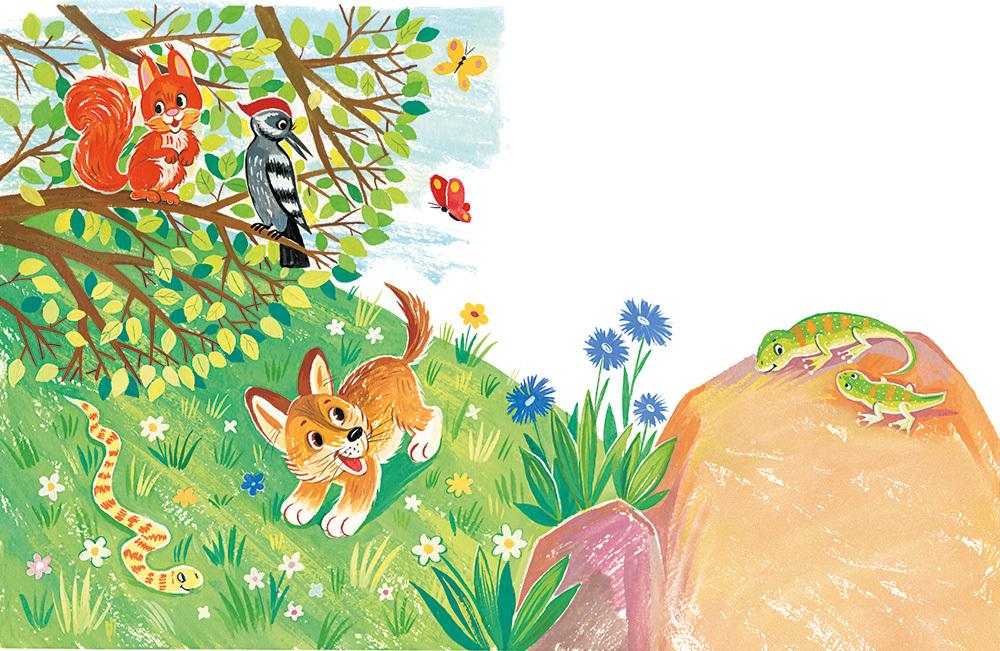 Ящерка побежала в лес. На опушке она увидела бельчонка.