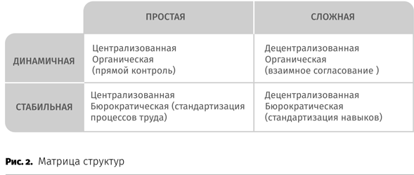 Эта матрица показывает, что важнейшие вопросы для оценки конкурентной среды — сложность бизнеса и его изменчивость. От чего же зависит, какой должна быть эффективная организация? От того, в каком конкурентном окружении она находится и какую стратегию она выберет