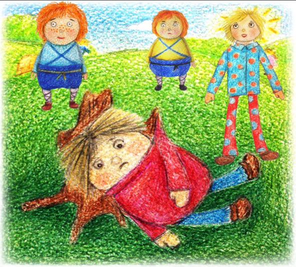 Хохотушка смастерила усы из длинных травинок и, смешно прижимая их верхней губой к носу, шепеляво уговаривала Капризушку примерить такие же. Та отталкивала одной рукой усы, другой Вреднюшку, норовящего столкнуть её вниз, и ныла в разные стороны: «Не-е-ет, не хочу усы, я не дяденька! Отстань, не толкайся!». Говорила она медленно, действовала быстро, и в какой-то момент ловко выхватила у подруги травяной жгут, а мальчишку столкнула вниз. В тот же миг оттуда раздался дикий вопль: «Приби-и-ил!». Малышня скатилась кубарем и окружила лежащего на земле Хитрушку. Он жалобно стонал, а Вреднюшка, угодивший сверху прямо на него, оправдывался: «Я нечаянно, меня Капризушка столкнула». «Случайно или нет, а раздавил товарища», — заметил осуждающе Озорушка. Толстый Вреднюшка зашмыгал носом, готовый вот-вот разрыдаться, Капризушка тоненько завыла. «А за нечаянно бьют отчаянно!» — звонко крикнул вскочивший Хитрушка и толкнул Вреднюшку в тугой живот, тот свалился и покатился бревнышком. «Обдурил-ил-ил…», — ругался он, подскакивая на кочках. Озорники поспешили за ним и вскоре живое, гомонящее, яркое, лоскутное одеяло накрыло лесную полянку.