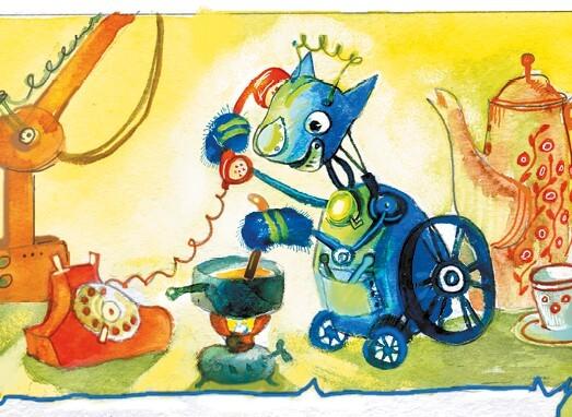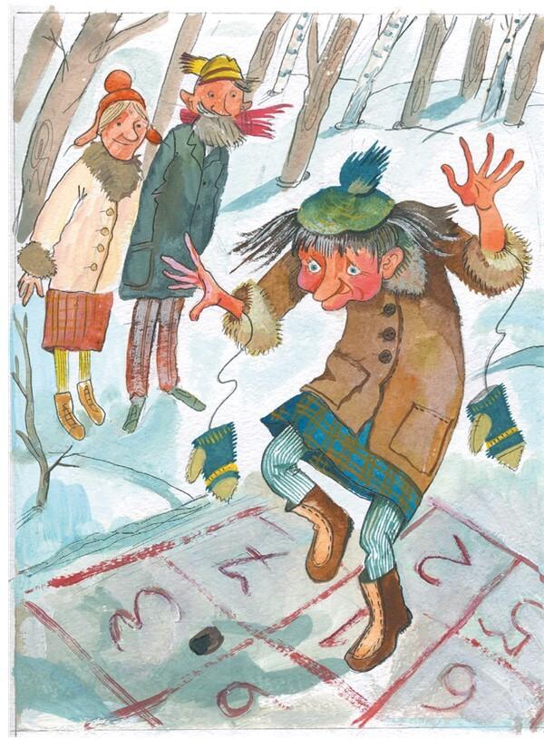 «Хорошо бы отдохнуть», – подумал Петя и вдруг увидел, что в стороне, за ёлками, белеет какой-то домик. Вошёл Петя в домик – хозяев нет. Стоит посреди комнаты стол. Над ним висит керосиновая лампа. Вокруг стола – четыре табуретки. Ходики тикают на стене. А в углу горою навалено сено.