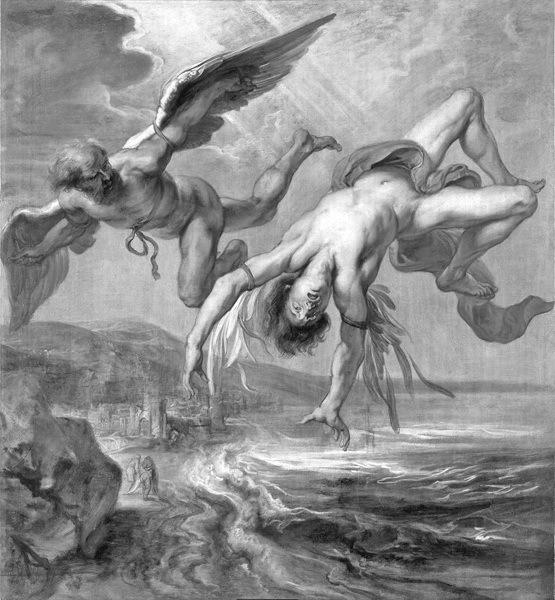 Но наказание не замедлило. Близкое солнце растопило своими горячими лучами скреплявший крылья воск: распавшиеся, они бессильно повисли на плечах мальчика и не могли больше сопротивляться ветру, и несчастный стремительно полетел вниз. Он хотел крикнуть отцу, но волны уже поглотили его… Когда Дедал обернулся кругом, он не увидел сына. Напрасно звал он его – никто не откликался ему в пустом пространстве.