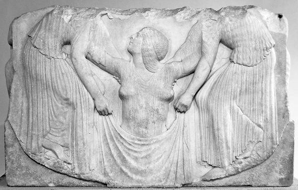 Рождение Афродиты из моря. Афродита в окружении двух нимф. Мрамор, центральная панель трона Людовизи. Ок. 465 г. до н. э.