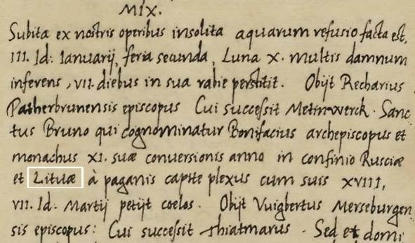 У Кведлінбургскіх аналах, датаваных XI стагоддзем, чытаем аб тым, што Бруна быў абезгалоўлены in confinio Rusciae et Lituae, гэта значыць «на мяжы Русі і Літвы».