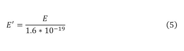 Далее из, приведённых вычислений, можно определить и напряжение, то есть кинетическую энергию долетающих до анода зарядов, откуда проявляется их напряжение (5), а поскольку известно значение плотности тока в самом катоде (6), то в зависимости от соотношения этой плотности тока и плотности вылетающего заряда можно найти процент выхода зарядов из катода (7) или своего рода катодную эффективность.