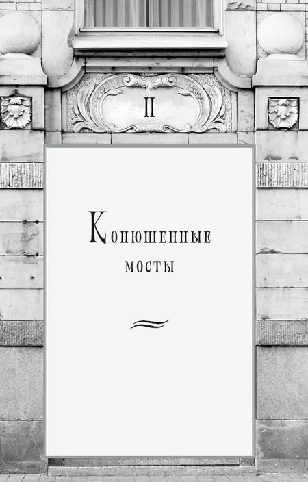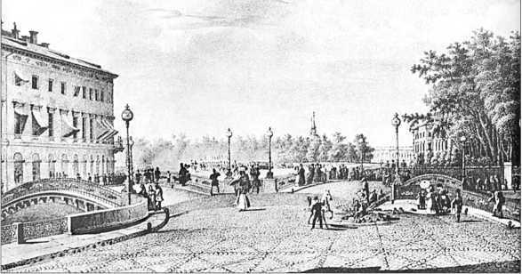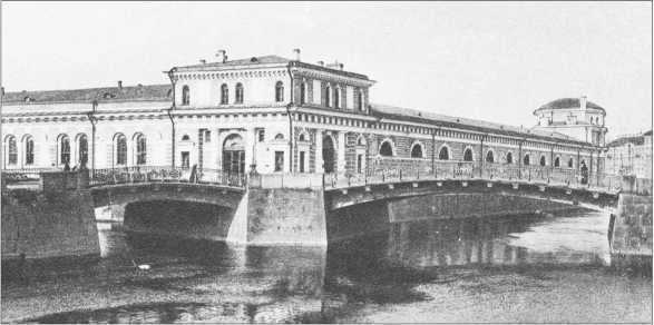 Бepera Мойки около здания Придворных конюшен связывают чугунные мосты: Большой Конюшенный и так называемый Трехколенный, состоящий из двух мостов, – Театрального и Мало-Конюшенного, дополненного третьим – ложным – пролетом. Эти мосты сооружались на исходе 1820-х годов. Но у них, естественно, существовали деревянные предшественники, построенные намного раньше. Они обеспечивали столь нужную постоянную связь между густонаселенным Адмиралтейским островом и левобережьем Мойки, где в первой трети XVIII века сформировались участки Конюшенного двора и трассы Конюшенных улиц с приходами инославных церквей.