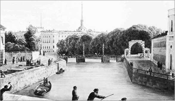С названием этого моста произошла путаница. Его называли Малым Конюшенным (Мало-Конюшенным), а также Царицынским и Театральным – по Царицыну лугу и построенному на нем в 1770-х годах театру. Все эти имена позднее переносились на смежный мост через исток Екатерининского участка Мойки. По ее берегам вбивались шпунтовые сваи[8]. Согласно указу 1736 года, русло реки вновь углубили, обновили деревянные подпорные стенки.