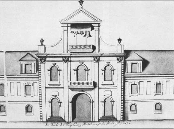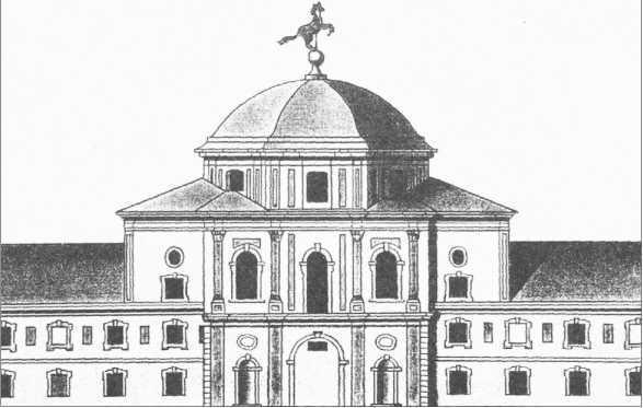 Ближе к концу XVIII века здание утратило свой главный вертикальный акцент – высокий купол со шпилем. Скорее всего, он был разрушен катастрофической бурей 1777 года[41]. Взамен на восьмигранном барабане соорудили пологий, приземистый купол, а на нем вновь установили скачущего коня на медном шаре.