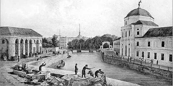Мойка получила каменное обрамление позднее, чем Екатерининский канал и Фонтанка. Такая последовательность кажется несколько странной – ведь Мойка протекала вблизи императорских резиденций, обводя первоначальное парадное ядро Адмиралтейской стороны. Вероятно, руководил сооружением ее набережных военный инженер И.К. Герард. Ранее он завершил строительство складов Новой Голландии в нижнем течении реки, внеся коррективы в проекты С.И. Чевакинского и Ж.-Б. Валлен-Деламота. «Архитектор при Императорских водяных строениях»[10], главный архитектор Адмиралтейств-коллегии Иоганн Конрад (Иван Кондратьевич) Герард занимался устройством каналов, участвовал в возведении гранитных набережных Фонтанки и Стрелки Васильевского острова, а также в создании группы парковых объектов Царского Села. Вне границ Петербурга он вел работы по Ладожскому каналу, Таицкому водоводу, Вышневолоцкой водной системе.