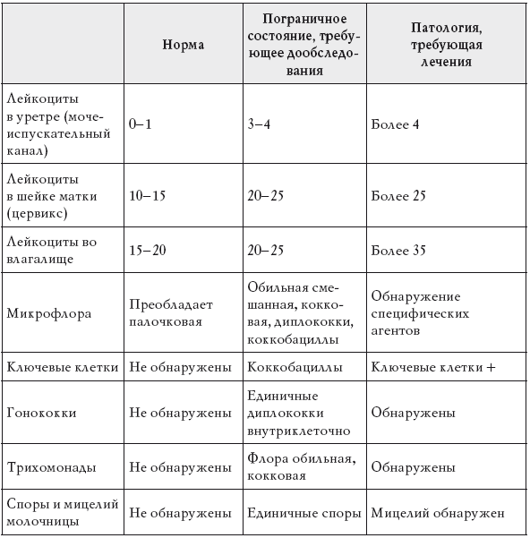 Если в результатах анализа вашего мазка лейкоциты в колонке «уретра» выше значения «3–4», а в колонках «шейка матки» и «влагалище» – выше значения «20–25 в поле зрения», в строчке «флора» вместо «преобладает палочковая» написано: обильная смешанная, кокковая, диплококки, коккобациллы, – то это причина, чтобы продолжить обследование, провести расширенную диагностику ИППП (инфекций, передаваемых половым путем) и назначить посев на микрофлору, микоплазменную инфекцию.