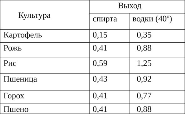 Примерный выход спирта и водки из 1 кг сырья (в л/кг)