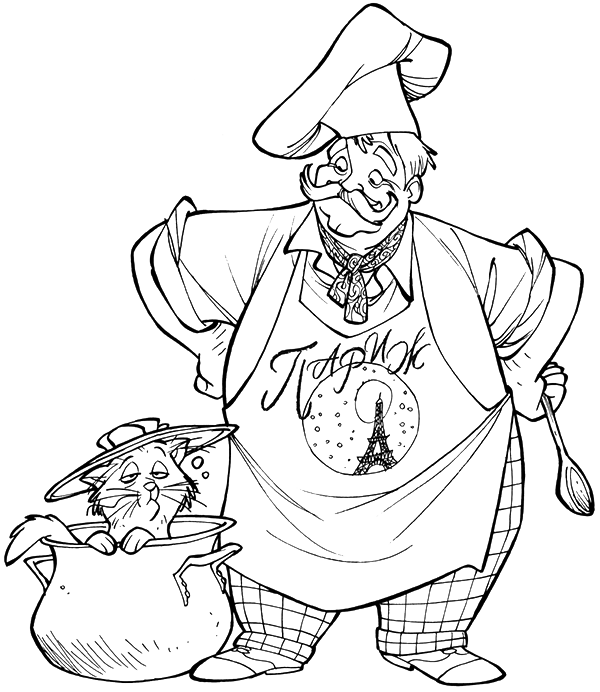 Кота прозвали так потому, что у него была привычка спать в посуде на ресторанной кухне, и несколько раз его даже чуть не поджарили. Пришлось синьору Шампиньону пристроить на дно старого котелка, которым уже никто не пользовался, подушку, и с тех пор кот всегда устраивается спать только здесь.