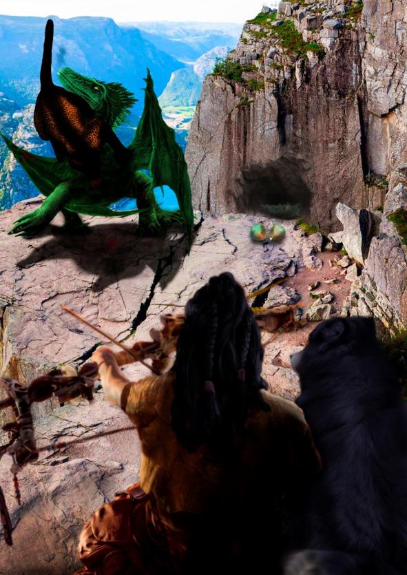 — «Хагир, тут что-то происходит. Скорее. Я сворачиваю за высокий утес с бурым верхом». — Прибежавший на зов Хранитель на полусогнутых ногах подобрался к залегшему за большим валуном Татру. Охотники думать забыли об убежавшей серне. Их взору предстало зрелище одновременно жуткое и величественное. В небольшой грот были натасканы еловые лапы и на них лежало крупное, похожее на громадный зеленый опал, яйцо. Второе валялось рядом разбитое. На площадке перед гротом огромный саблезуб вцепился в шею изумрудного дракона. Скорее всего, это была драконица, защищавшая свое гнездо. Изумрудные драконы были не очень крупные, примерно с лошадь размером. Для людей они опасности не представляли хотя, будучи плотоядными, охотились на всякую бегающую мелочь.