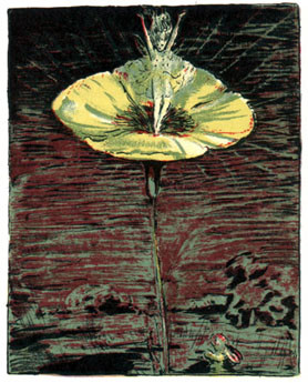 And then a strange thing happened. For where the tear had fallen a flower grew out of the ground, a mysterious flower, not at all like any that grew in the garden. It had slender green leaves the colour of emeralds, and in the centre of the leaves a blossom like a golden cup. It was so beautiful that the little Rabbit forgot to cry, and just lay there watching it. And presently the blossom opened, and out of it there stepped a fairy.
