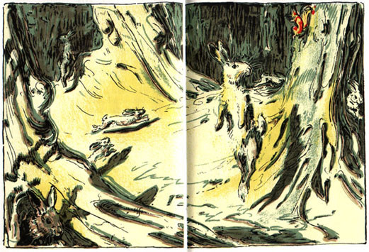 And she held the little Rabbit close in her arms and flew with him into the wood.
