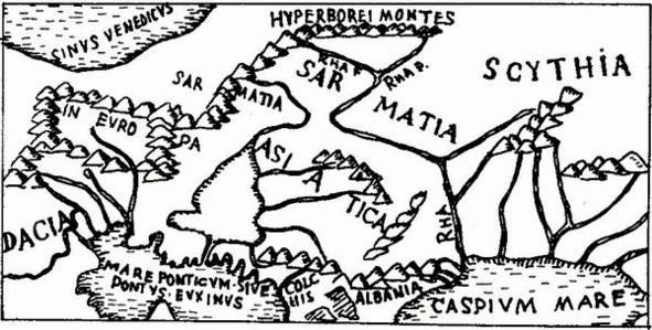 When we compare the map of the European part of the Soviet Union19 with Ptolemaeos’ map, we can see genuine geographical sites such as the Baltic, Black, Azov and Caspian seas, and the Volga running into the Caspian and called Rha*, the ancient Avesta name. We also see all the more or less significant elevated areas up to the Southern Urals, which are separated by a considerable distance from the Hyperborei Montes that Ptolemaeos marked in the north and that extend latitudinally, and that are the starting point of two sources of the holy river of the ancient Iranians-Rahi. This map indicates that Ptolemaeos, and probably geographers of antiquity long before him, make a distinction between the Hyperborei and the Ripei mountains, and the Urals.