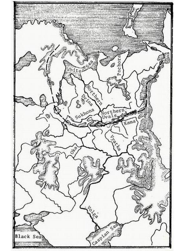 If we accept the Ripei (Hyperborei) and Kukaiya mountains as the Northern Uvals, the six rivers are readily found. The Volga (Rusiya) is indeed the drainage point of six rivers that flow from the Uvals — the Kama, Vyatka, Vetluga, Unzha, Kostroma and Sheksna.* Thus, if we regard the Kama as the source of the Volga, as was the case in ancient tradition, then the Volga (Rha) of Ptolemaeos and Avesta, indeed, begins in the Northern Uvals (especially since the actual sources of the Volga are in the Valdai elevation which is included in the southern part of the bulge described). They are also the starting point of the biggest river in the Russian North — the great and deep Northern Dvina which runs into the White Sea and has over a thousand tributaries. One of them, the Emtsa River, does not freeze over in the winter due to the hot springs in its canyon.