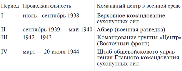 К лету 1938 года оппозиция в военной среде сформировалась, и ее контуры обозначились довольно четко. Она действовала в унисон с оппозицией в обоих гражданских секторах, а иногда действия всех трех оппозиционных составляющих пересекались между собой. Если в политическом секторе признанным лидером был Герделер, а во внешнеполитическом – Вайцзеккер, то среди военных такое положение занял генерал Бек.