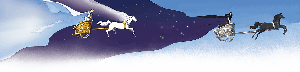 У одного из великанов Ётунхейма была черноглазая и темноволосая дочка по имени Ночь. А у неё родился сын День – светлоокий и прекрасный. Один призвал их к себе и подарил каждому коня и колесницу. Потом он отправил их на небо и велел объезжать мир. Ночь отправляется в путь первой и окутывает землю мраком. После неё на небо выезжает День, и свет от сияющей гривы его коня озаряет всё вокруг.