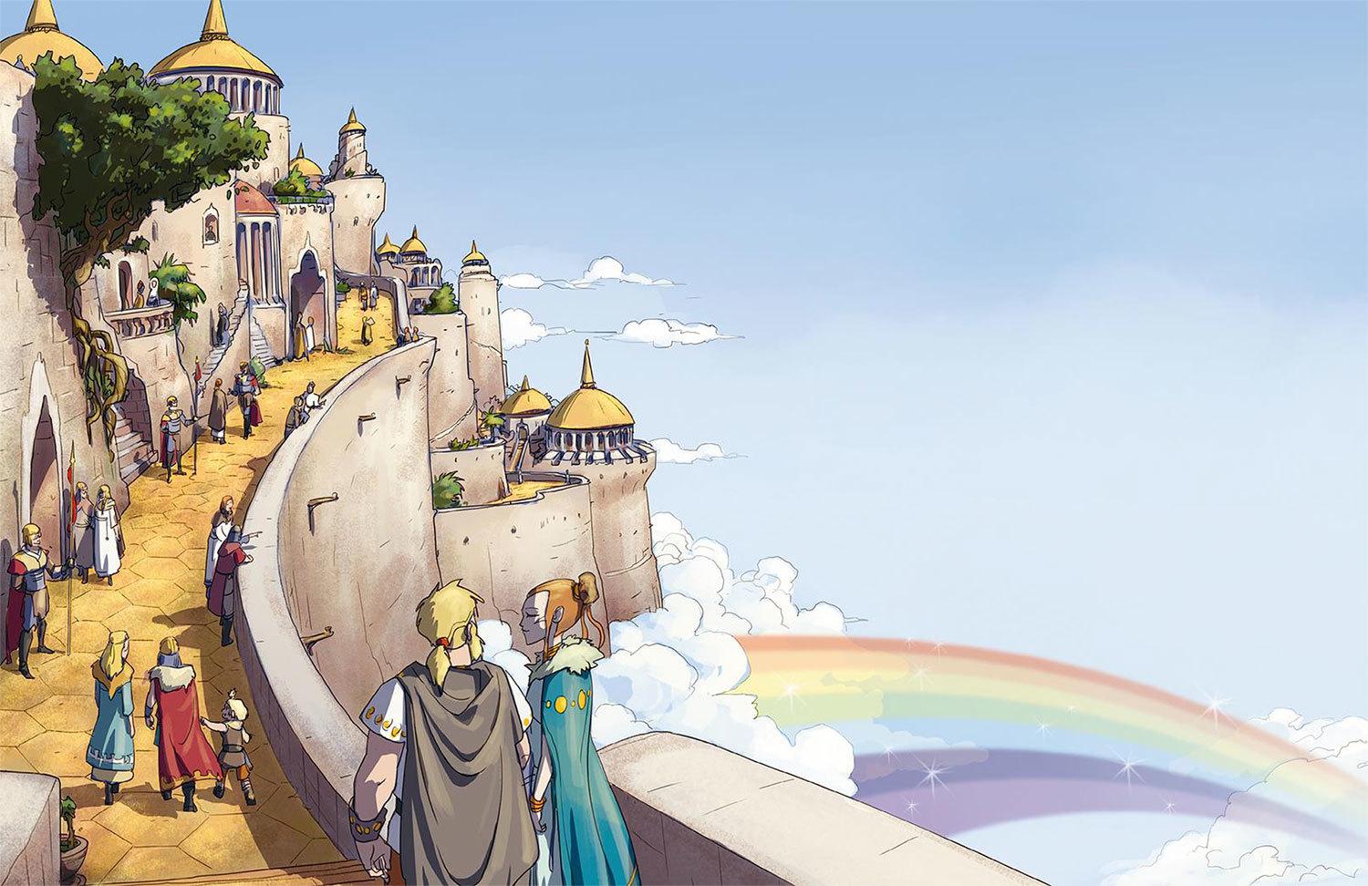 Царство богов получило название Асгард. Оно было могущественным и красивым, с сияющими дворцами и плодородными землями, и его защищали высокие стены с башнями.