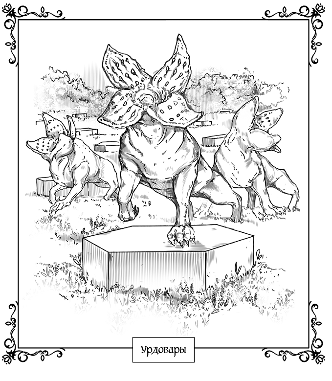 В зеленоватом сиянии осветительных ракет, медленно планирующих к земле, вставали над сугробами мрачные шестиугольные надгробия. А на них и между ними виднелись скользкие черные твари, похожие на бульдогов. Урдова́ры. Крупные, человеку по пояс, с широкой грудиной. Голова — одна сплошная четырехстворчатая пасть с зубьями-иглами в три ряда, задние лапы короткие, вывернутые — благодаря им твари прыгали далеко, отталкиваясь, как на пружинах. Пасти непрерывно раскрывались и закрывались, показывая черные сокращающиеся воронки из плоти — будто урдовары постоянно сглатывали. И воняло от них тухлятиной и ацетоном. Как, богам на милость, бороться с теми, кому неведомы боль и страх? Кто существует только ради уничтожения живого, ради поглощения горячей крови и мяса?